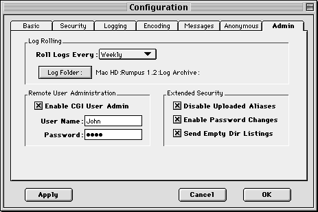 The final configuration pane permits the setup of several general purpose administration options. These options make using Rumpus easier and more secure, while automating routine maintenance. Figure 11 shows a sample setup of the "Admin" Configuration tab.